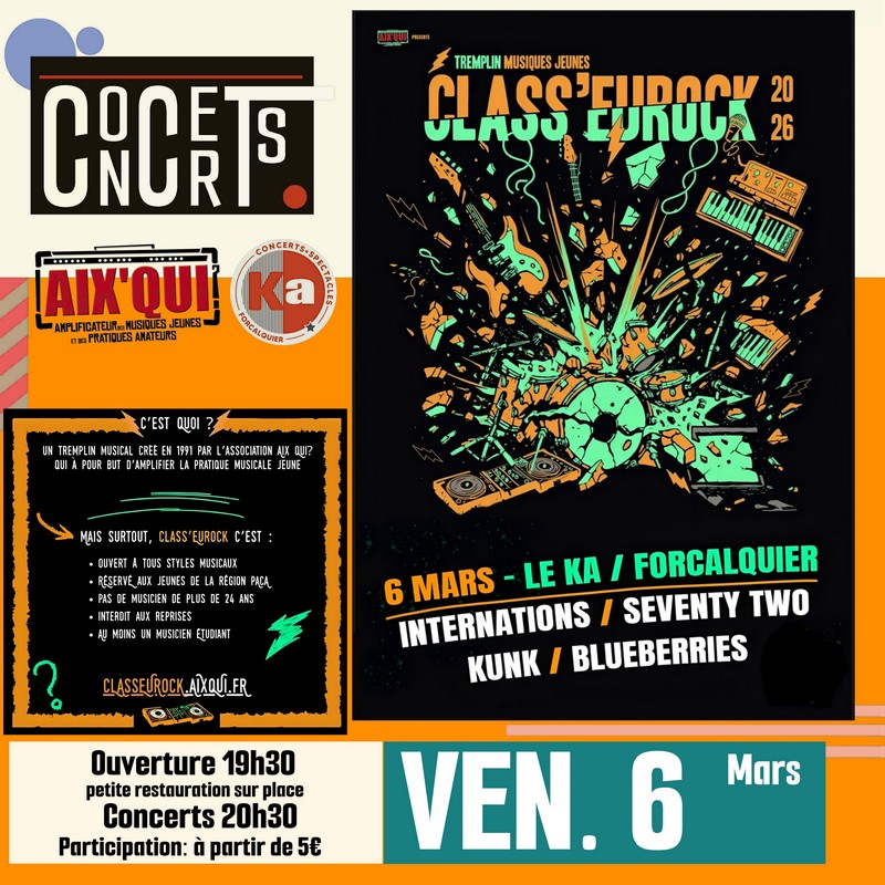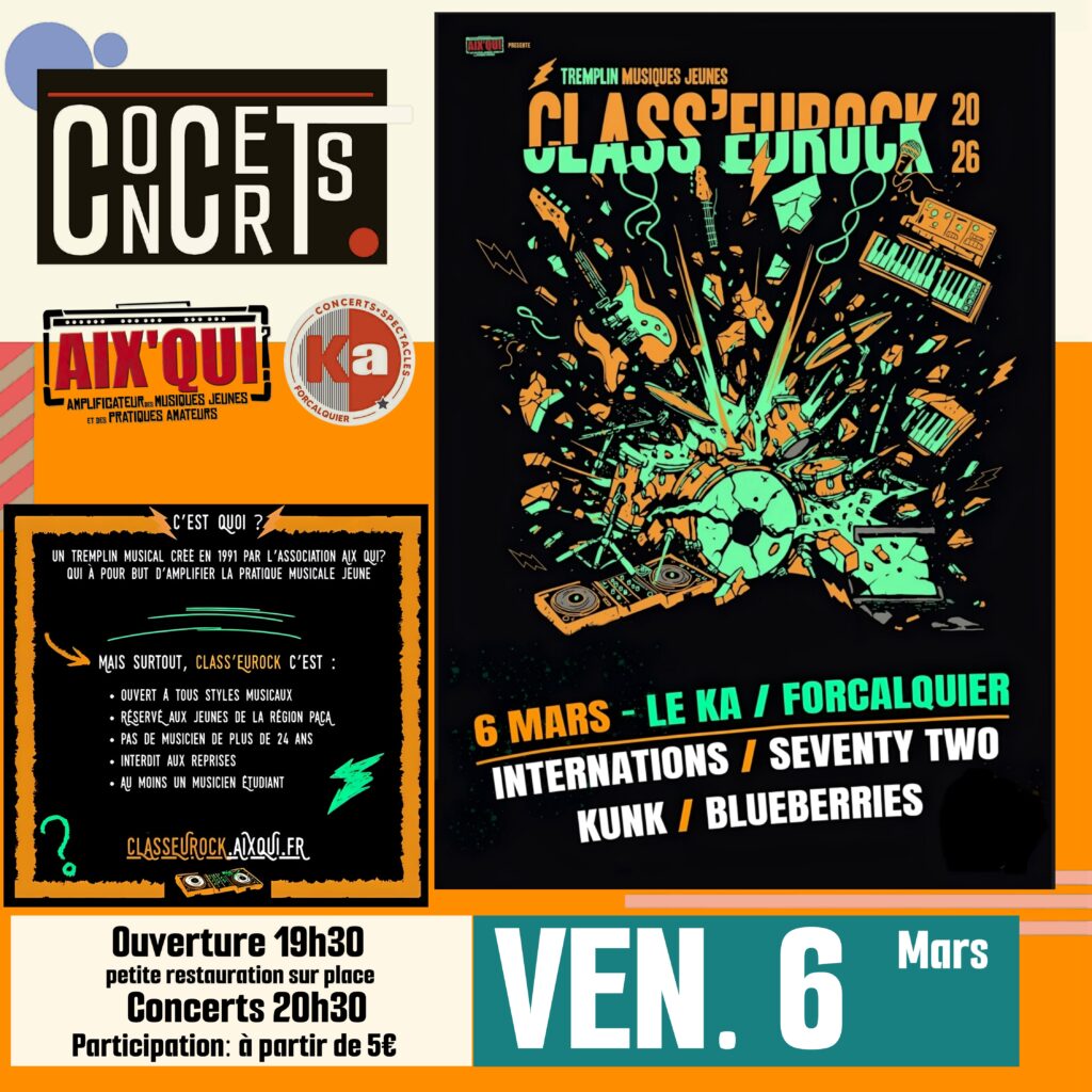 Jeunes groupes des Alpes de Haute Provence, jeunes musiciens. nes de 23 ans max, c’est aussi pour vous que l’Association Aix’Qui? organise depuis bientôt 35 ans ce fameux tremplin. Classeurock dont sont issus Dagoba, Hyphen Hyphen, Soma, Deluxe et bien d’autres.