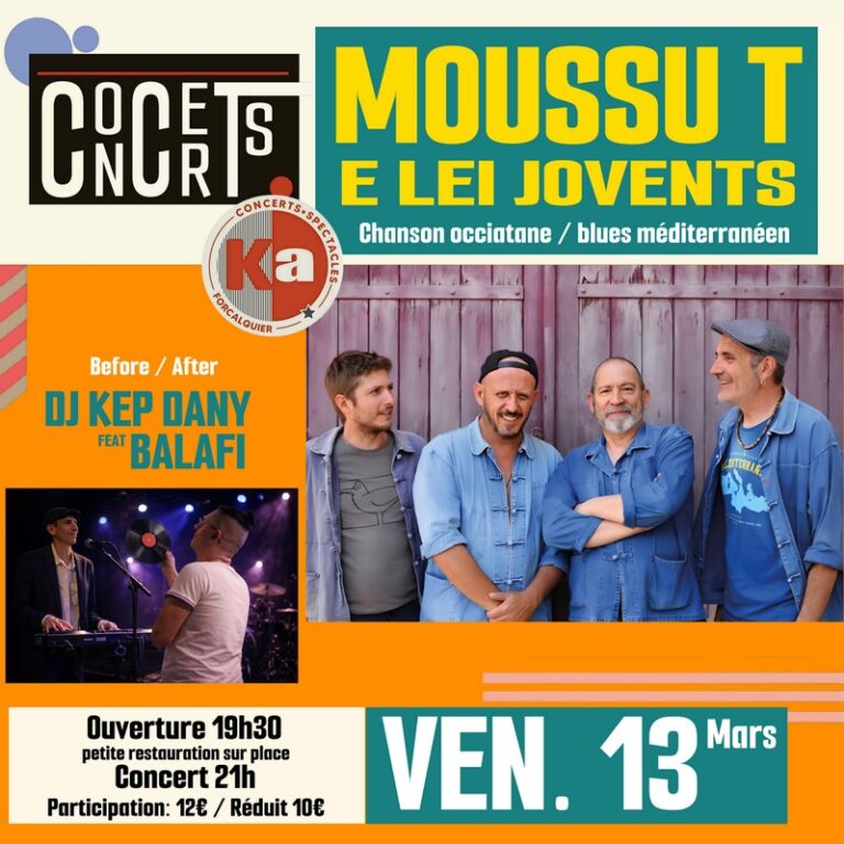 Ouverture 19h30 – Petite restauration su place Concert 21h – participation 12€ – réduit 10€ MOUSSU T E LEI JOVENTS Moussu T e lei Jovents naviguent depuis une vingtaine d’années entre Marseille et les Amériques, entre le cœur du XXe…