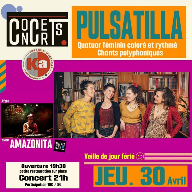 PULSATILLA Munis d’un instrumentarium varié (Accordéon, Guitare, Congas, Cajon et autres percussions à main), c’est avec une bonne dose de joie, d’humour et de simplicité que nous vous embarquerons dans notre univers éclectique : telles des abeilles butineuses, nous prenons…
